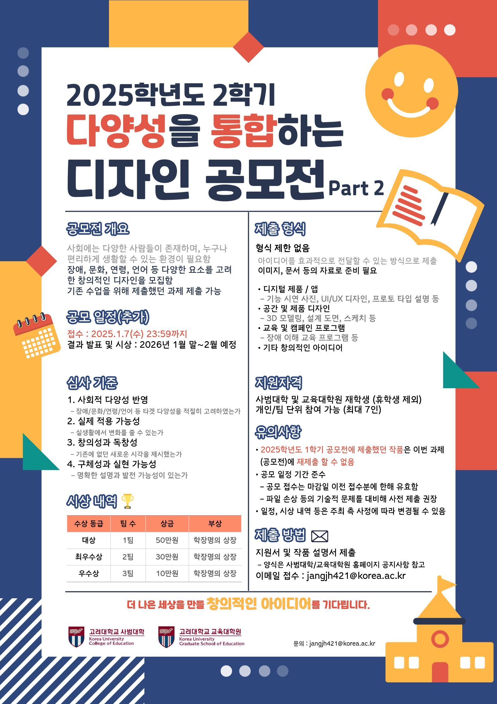 | 제목 | 「2025-2 다양성을 통합하는 디자인 공모전Part 2」 작품 추가 모집(~1/7) |