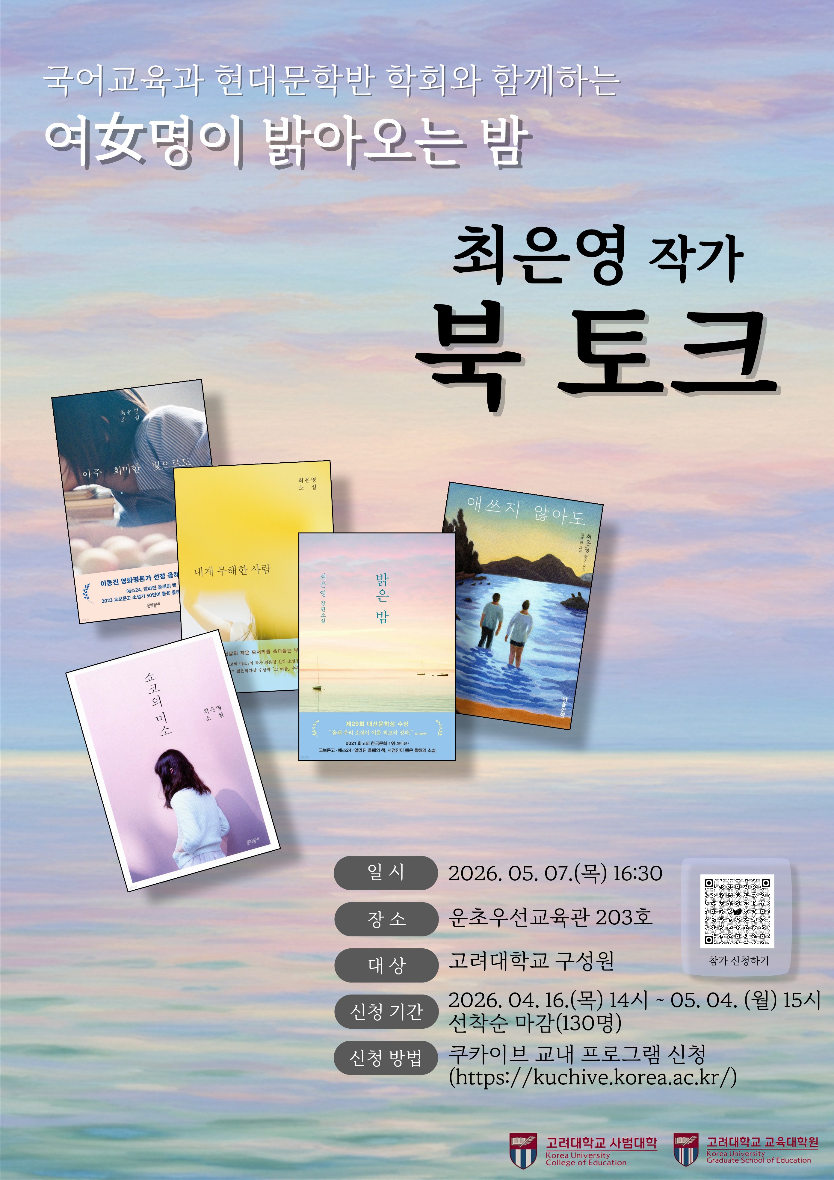 <국어교육과 현대문학반 학회와 함께하는 여女명이 밝아오는 밤: 최은영 작가 북토크> 1. 일시: 2026.5.7.(목) 16:30 2. 장소: 운초우선교육관 203호 3. 대상: 고려대학교 구성원 4. 신청 기간: 2026.4.16.(목)14시~5.4.(월)15시 5. 신청 방법: 쿠카이브 교내 프로그램 신청(https://kuchive.korea.ac.kr/) |