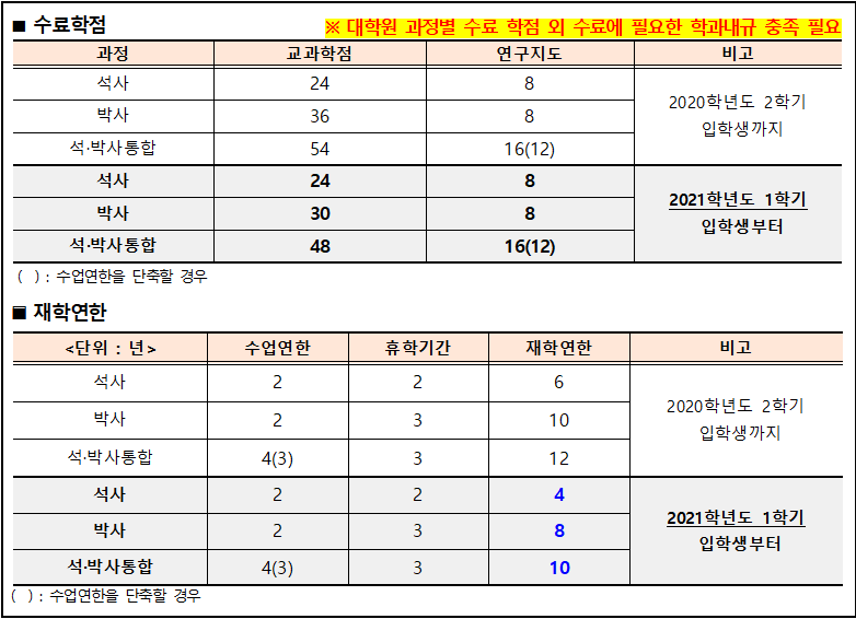 2026학년도 1학기 일반대학원 학적변동 안내 ■ 학적변동 기간: 2026년 2월 2일(월) 09:00 – 2월 25일(수) 16:00까지 ■ 학적변동신청은 반드시 해당기간 안에 신청완료 해야 함(기한 엄수) ※ 해당 신청기간 이외 신청 절대 불가 ■ 자세한 내용은 아래 학적변동 사항을 반드시 확인하기 바랍니다. ※학적변동 신청기간은 항목별로 마감일이 다를 수 있음에 유의 ■ 일반대학원 수료학점 및 재학연한
